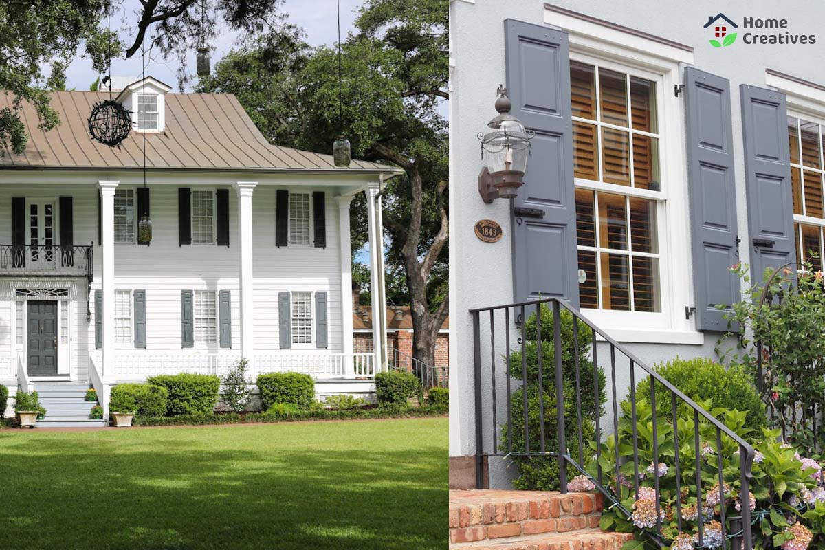 | Windows | Double-hung, evenly spaced, often with shutters |